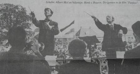 De opvallendste deelnemer aan het 10e topconcours basis en middenklasse op zaterdag 27 april jongstleden in het Musis Sacrum in Arnhem was de combinatie Giethoorns Fanfare/Onderling Genoegen uit Giethoorn/Wanneperveen. Want juist in de week waarin de landelijke media meer dan gebruikelijke belangstelling toonden voor de meesterwerken van filmer Bert Haanstra musiceerde op het podium van Musis Sacrum een aantal hoofdrolspelers uit de film 'Fanfare' van Haanstra. Deze niet meer zo piepjonge musici lieten horen nog een aardig partijtje te kunnen meeblazen hoewel de muzikanten uit het Overijsselse Venetie niet tot de kampioenen behoorden. Een tweede plek is toch ook niet gek ?? Giethoorns Fanfare: Foto.